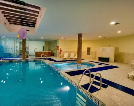 Gasten kunnen gebruikmaken van het binnenzwembad, de fitnessruimte, sauna en jacuzzi, wat dit complex ook in de winter aantrekkelijk maakt. Daarnaast is er een restaurant waar je terecht kunt voor ontbijt, lunch en diner, en een klein zonneterras voor de warmere dagen. Ook is er een receptie en lift aanwezig.